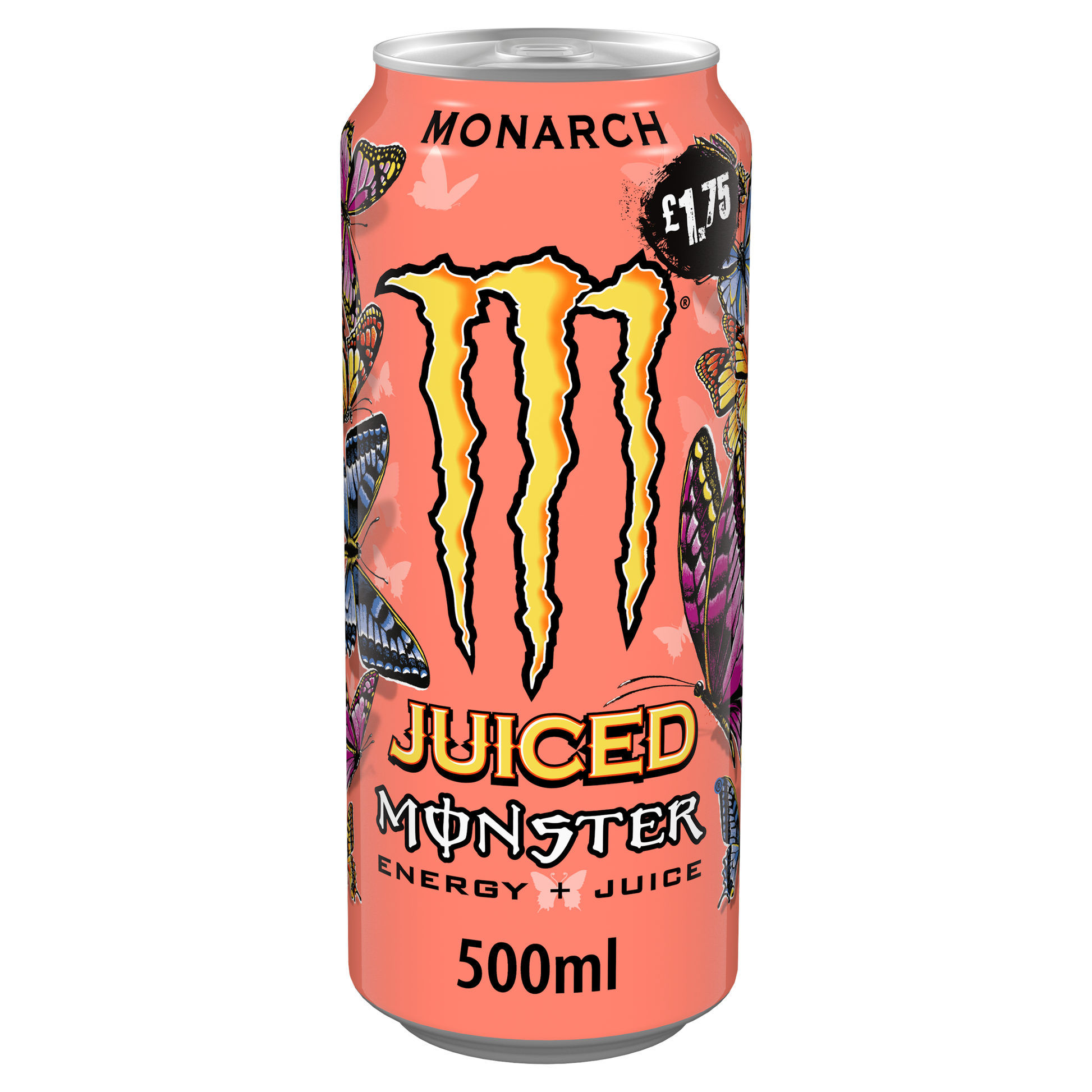 Juiced Monster Monarch 500ml can - carbonated energy drink with taurine, L-carnitine, inositol and B vitamins. Monster Energy Juiced Monarch has a light, subtle flavour with hints of peach and nectarine. Juiced Monster delivers full fruit flavours with 160mg of caffeine. Serve cold for maximum refreshment.