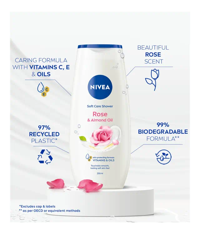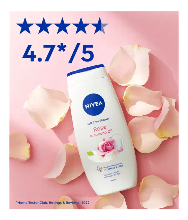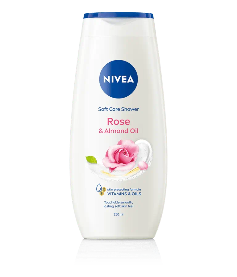 Caring shower gel with almond oil for a touchably smooth and lasting skin feel. Formulated with vitamin C & E and precious oils protect the skin from drying out: NIVEA Rose & Almond Oil shower cream.